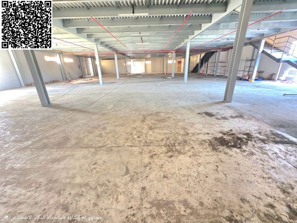 A large warehouse on the main street in the Al Jarf Industrial Area, with a very large parking area for trucks. It has two large main entrances, a large rear entrance, and several smaller service entrances. Suitable for a wide range of businesses. Approximately 15000 square feet. Ground floor area 8800 square feet. Mezzanine area 6160 square feet. Includes offices and restrooms. Equipped with