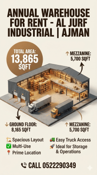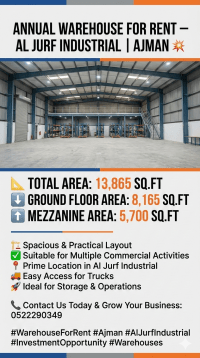Annual Warehouse for rent - Al Jerf Industrial Ajman A large - scale warehouse ideal for expanding your business Warehouse Details Total Area 13865 SqFt Ground Floor 8165 SqFt Mezzanine 5700 SqFt Features Spacious & practical layout Suitable for multiple commercial activities Prime location in Al Jerf Industrial easy access for trucks Ideal for storage & operations Contact us today and grow