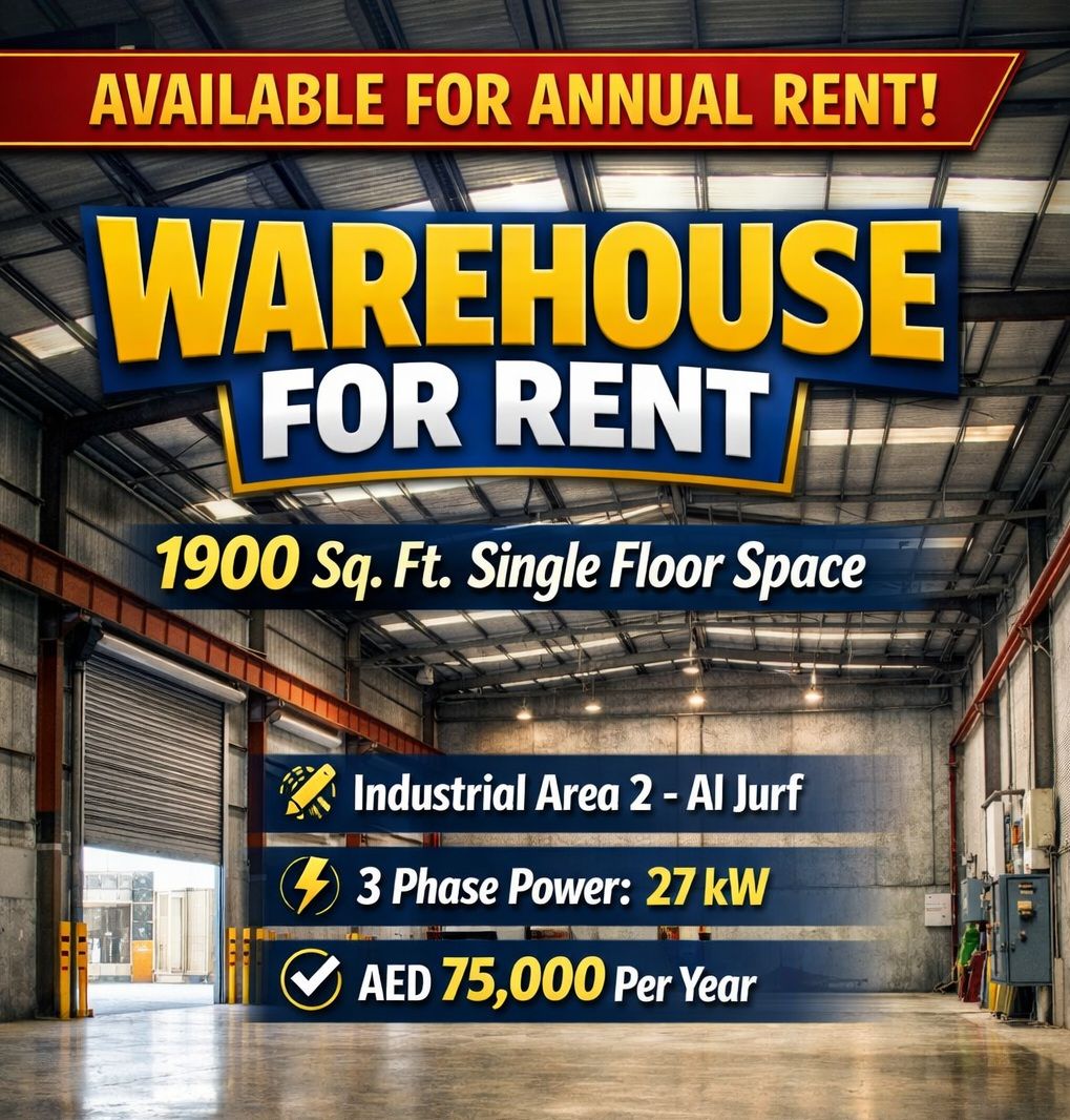 Warehouse for Annual rent - Al Jerf Industrial Area 2 Ajman An excellent opportunity for commercial and Industrial activities. Property Details Size 1900 SqFt. Single Floor Warehouse 3 Phase Power - 27 kW Prime Location - Al Jerf Industrial Area 2 Rental Price AED75000 per year Contact us