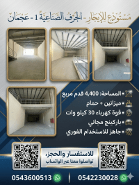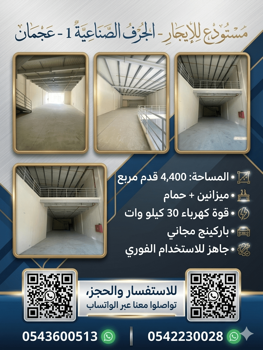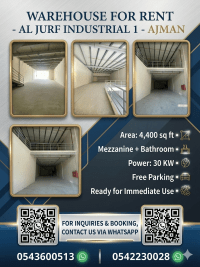 Premium Warehouse for rent - Al Jerf Industrial 1, Ajman A spacious and well - maintained warehouse located in a prime Industrial Area, ideal for various commercial and Industrial activities. The property is designed to meet business needs with excellent specifications and easy access for transportation and logistics. Property Details Area 4400 SqFt Mezzanine Floor + Bathroom Power Supply 30 KW Free