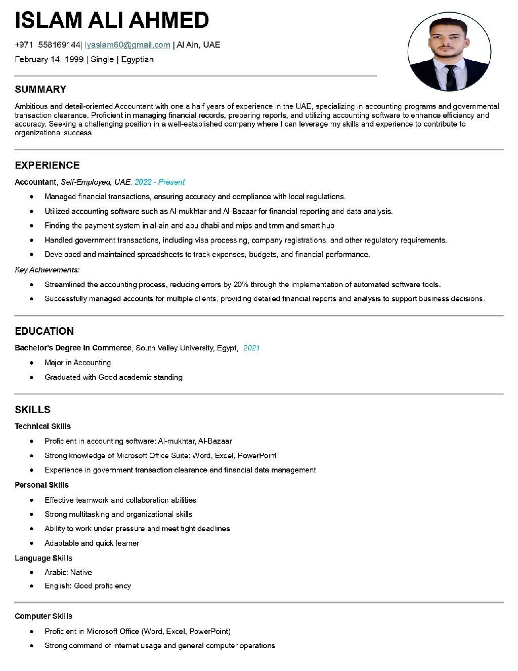 محاسب يعمل علي برنامج المختار والبازار وسيستم بنك أبوظبي الأول والميبس وتم وسمارت هب وعمل ضريبة القيمة المضافة وكل المعاملات