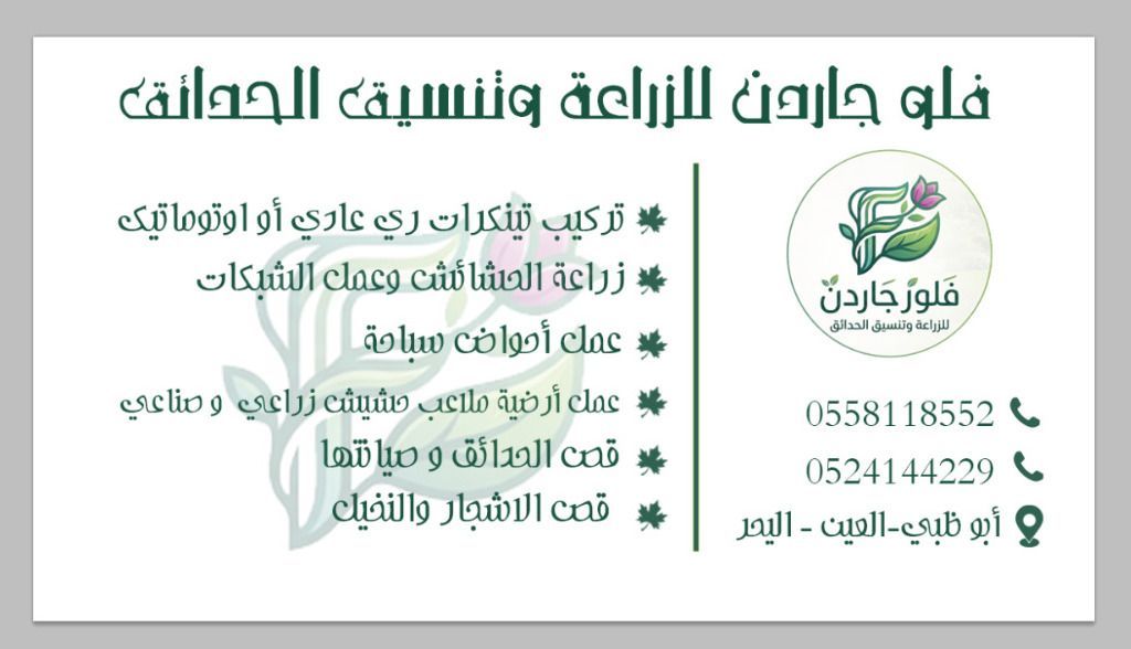 تعلن شركة فلوردجاردن لتزيين الحدائق العامة والخاصة وعمل شبكات الري العاديه والأوتوماتيك وصيانتها وتنفيذ حمامات السباحة وقص الشجر والنخيل