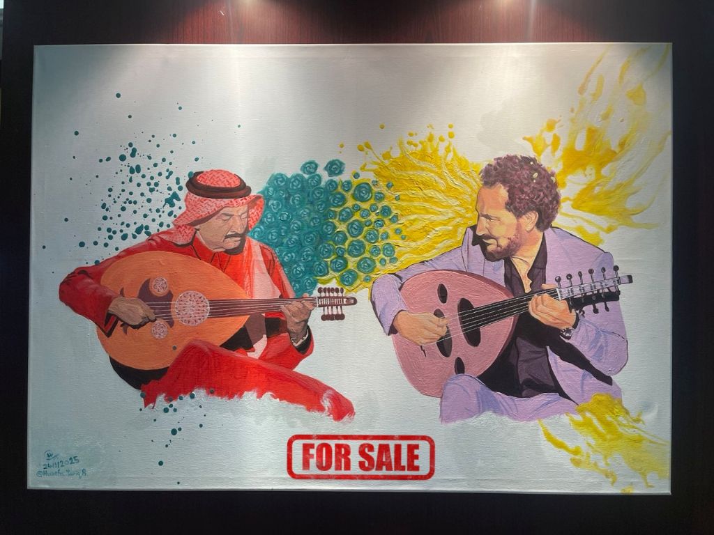 لوحة نابضة بالحياة تترجم لقاء قمتين من قمم العود الشرقي الى سيمفونية بصرية ساحرة في هذا الفضاء الفني، يتجسد الانسجام الأبدي بين نصير شمة وعبادي الجوهر، حيث تتمازج أوتار عودهما لا لتسمع، بل لترى في تدفق الالوان وكانها تموجات صوتية تتشكل حولهما. تتراقص لمسات الالوان الم عبرة عن حال فردته ما، مترجمة أصداء النغمات العبقرية التي ولدت من لقائهما، ومضيفة بريق الوعي الفني الذي يتجلى في كل عزفة. هذه الالوان