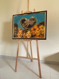 عمل فني للاقتناء "نبض العالم" لوحة تعانق الانسانية في لوحة "نبض العالم" تتجسد رسالة حب عالمية، حيث يتداخل فيها الفن ليصبح صوتا ينادي بالوحدة. تترجم اللوحة وجوها بريئة تنتمي الى ثقافات مختلفة، محاطة بتكوين هندسي يشبه خيوطا ذهبية لامعة، وكانها تربط بين أطراف الكون. في قلب اللوحة، يتشكل قلب كبير يحمل خريطة العالم، وكأنه ينبض بحياة واحدة، حياة البشرية جمعاء. هذا القلب ليس مجرد رمز، بل هو مصدر الطاقة