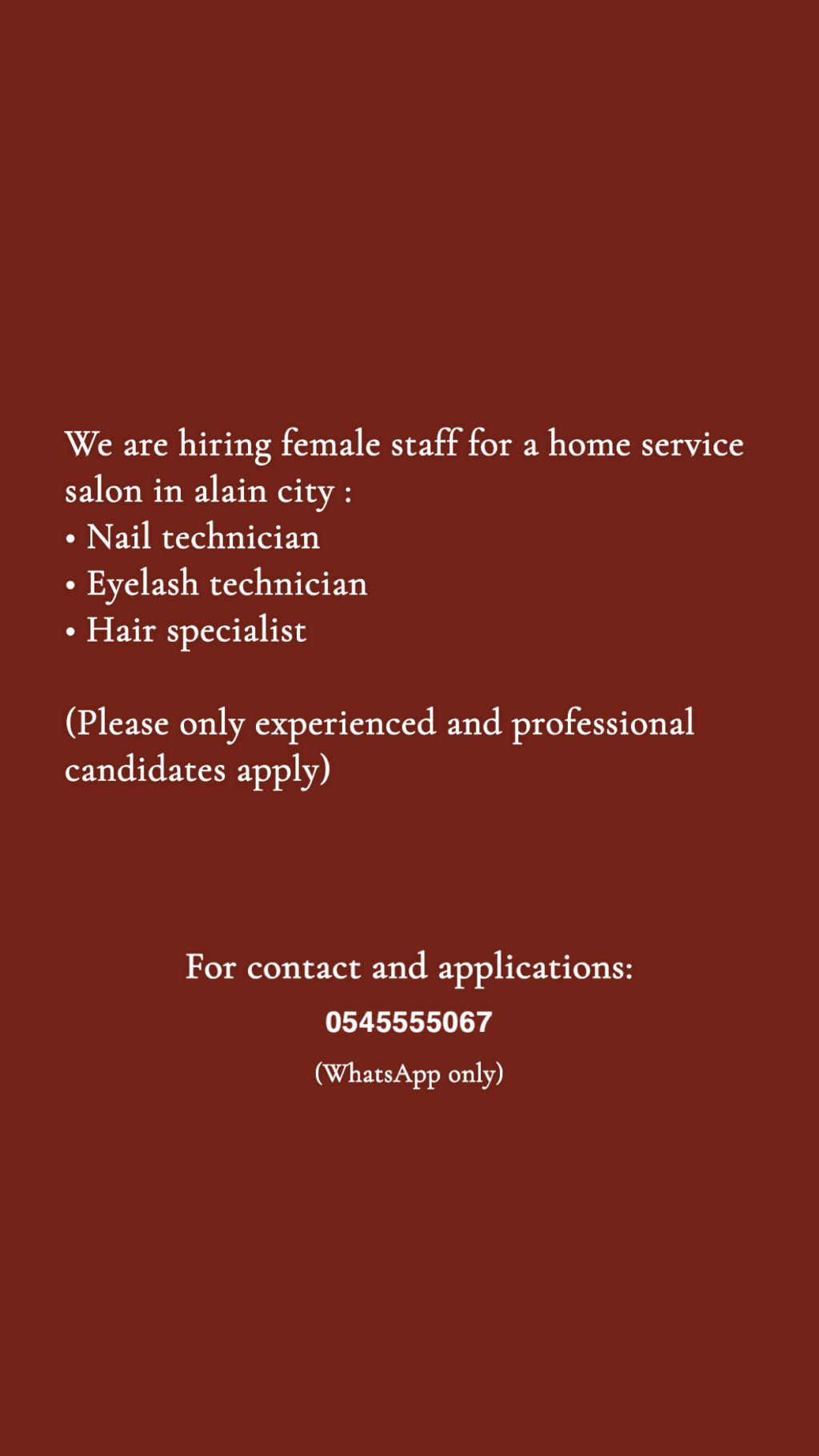 مطلوب موظفات لصالون خدمة منزلية في مدينة العين الخبيصي / مطلوب خبيرة اظافر - خبيرة رموش - خبيرة شعر (الرجاء التواصل للخبيرات والمتمرسات فقط) للتواصل والتقديم