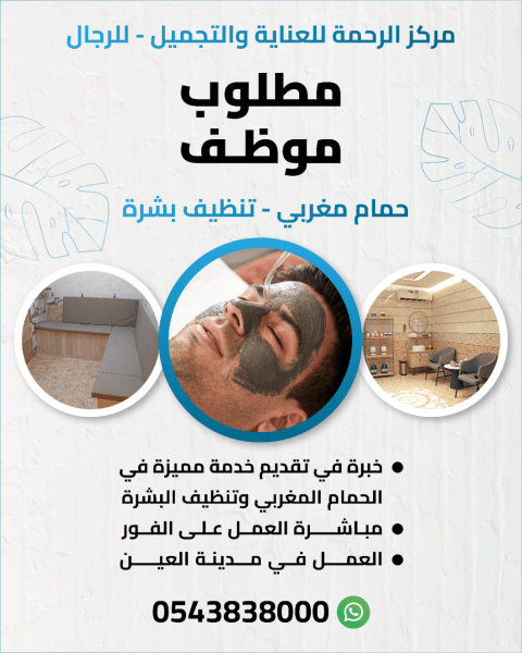 مركز الرحمة للعناية والتجميل - للرجال مطلوب موظف للعمل في الحمام المغربي وتنظيف البشرة والعناية بالرجال. في مدينة العين. مباشرة العمل على الفور. للتواصل، الرجاء ارسال رسالة على الواتساب على الرقم