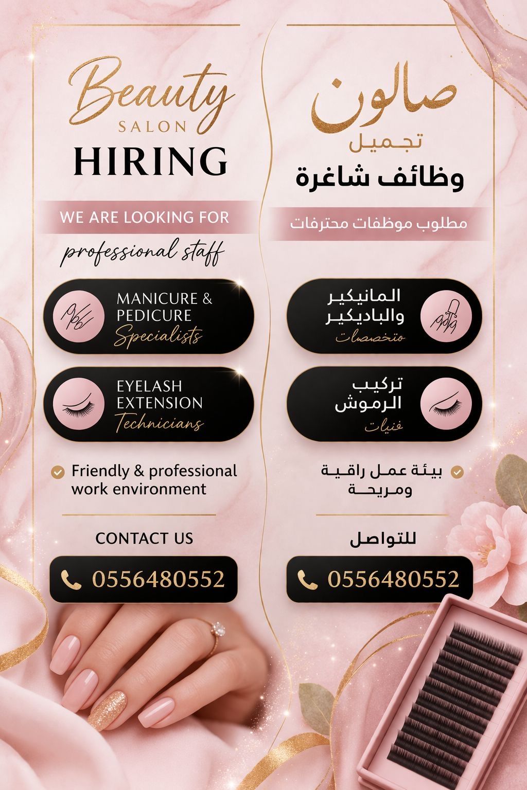 We are hiring experienced female staff for a beauty salon in Khalifa street Al Ain manicure pedicure specialist Acrylic Eyelash extensions technician