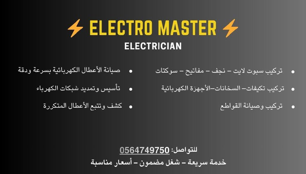 ألو كهربجي - لخدمات الصيانة والتأسيس فني كهرباء متخصص في جميع أعمال الكهرباء للمنازل والفلل والمحلات صيانة الأعطال الكهربائية بسرعة ودقة تأسيس وتمديد شبكات الكهرباء تركيب سبوت لايت - نجف - مفاتيح - سوكتات تركيب وصيانة القواطع تركيب تكيفات - السخانات - الاجهزة الكهربائية كشف وتتبع الأعطال المتكررة للتواصل خدمة سريعة - شغل مضمون - أسعار مناسبة