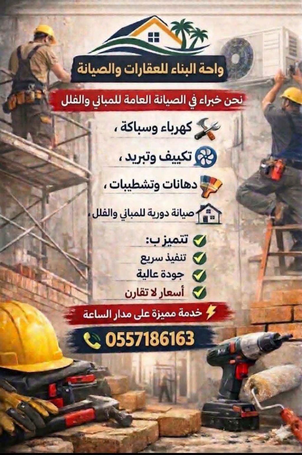 واحة البناء للعقارات والصيانة فريق عمل بكفاءة عالية في الصيانة العامة للمباني والفلل خدمة مميزة على مدار الساعة اتصل الآن