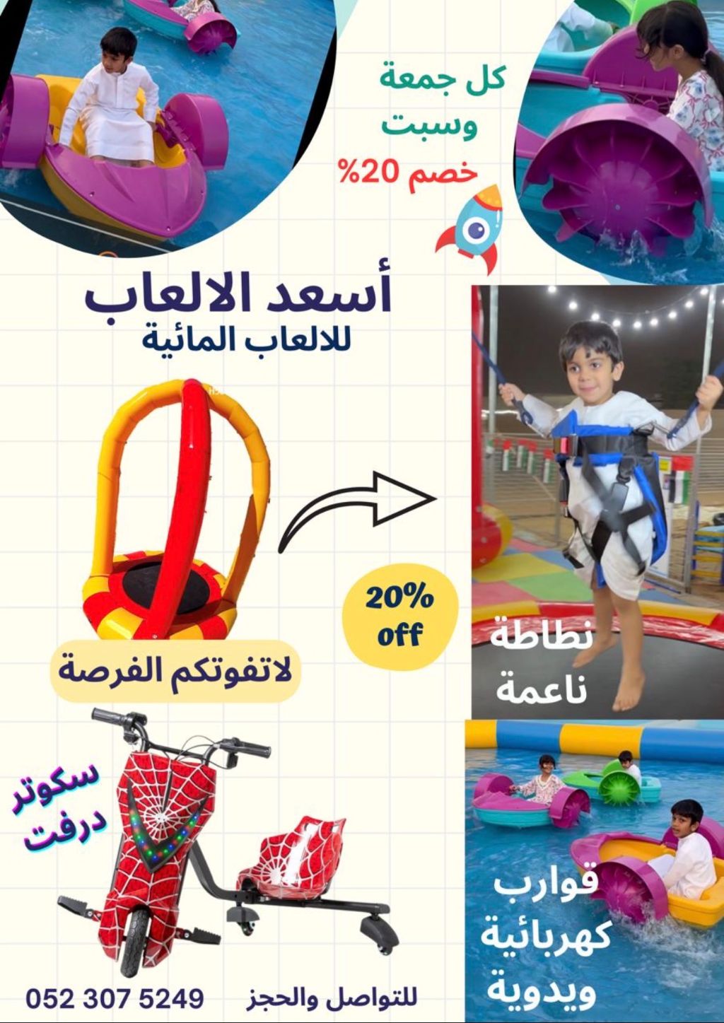 فرصة ذهبية للاستثمار أو الشراء مشروع ترفيهي جاهز للتشغيل داخل منتزه وايت هورس - زاخر بموقع زاوية مميز ومساحة 15*15م، يضم مركز ألعاب مائية متكامل (قوارب كهربائية ويدوية، أحواض، نطاطات، كرات مائية، سكاي لاين مغامرات) سكوترات كهربائية، وكشك مكيف مجهز (ألعاب، عصائر، غزل البنات) مع عمالة جاهزة وعقد إيجار مستمر حتى نوفمبر 2026، المشروع قائم ويحقق جذبا عاليا للعائلات والسياح وقابل للتوسع الفوري، التنازل
