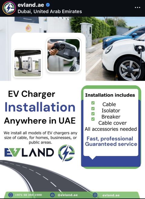 توفر EVLAND حلول شحن متكاملة للسيارات الكهربائية في جميع أنحاء الامارات. نقدم خدمة تركيب احترافية لاجهزة الشحن، بالاضافة الى بيع شواحن السيارات الكهربائية والمحولات والملحقات. خدمة سريعة، منتجات موثوقة، وتغطية شاملة للدولة EVLAND تبقي سيارتك الكهربائية جاهزة دائما