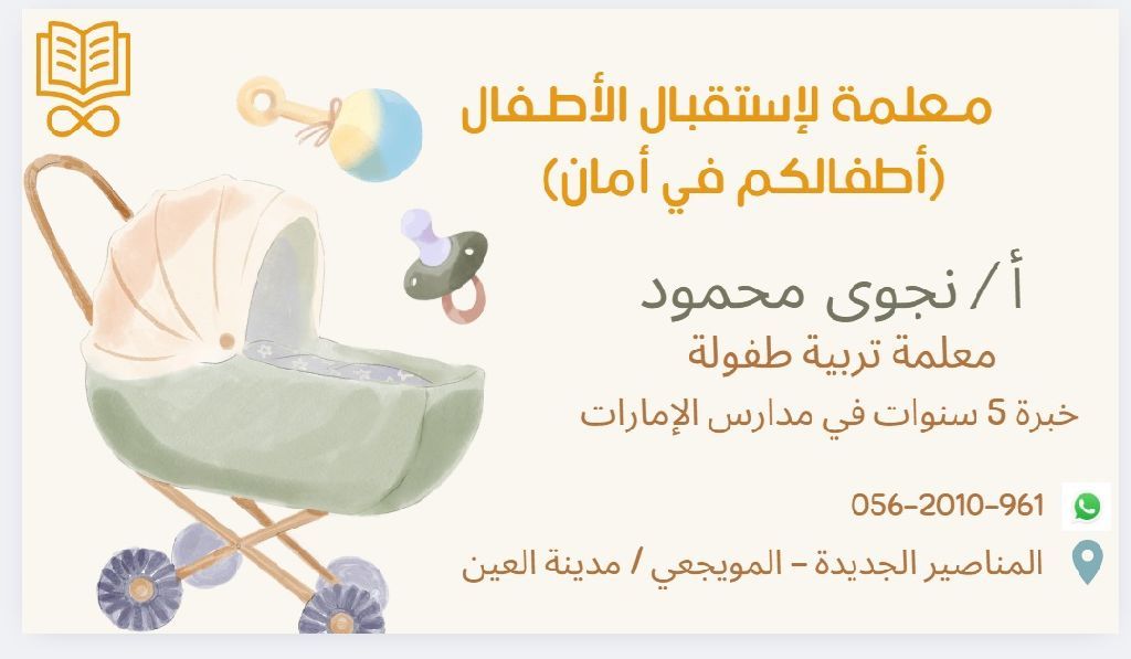 هل تبحث عن رعاية آمنة ومحترفة لطفلك أنا معلمة اطفال متمرسة، أقدم خدمة رعاية شاملة في بيتي المجهز بالكامل. بخبرة تزيد عن 5 سنوات في مدارس الدولة، أستطيع توفير بيئة محفزة وآمنة، حيث يمكن لطفلك اللعب والتعلم. أسعى لخلق جو عائلي دافئ يجعله يشعر بالراحة والاطمئنان، وكأنه في منزله. العنوان المناصير الجديدة - مدينة العين
