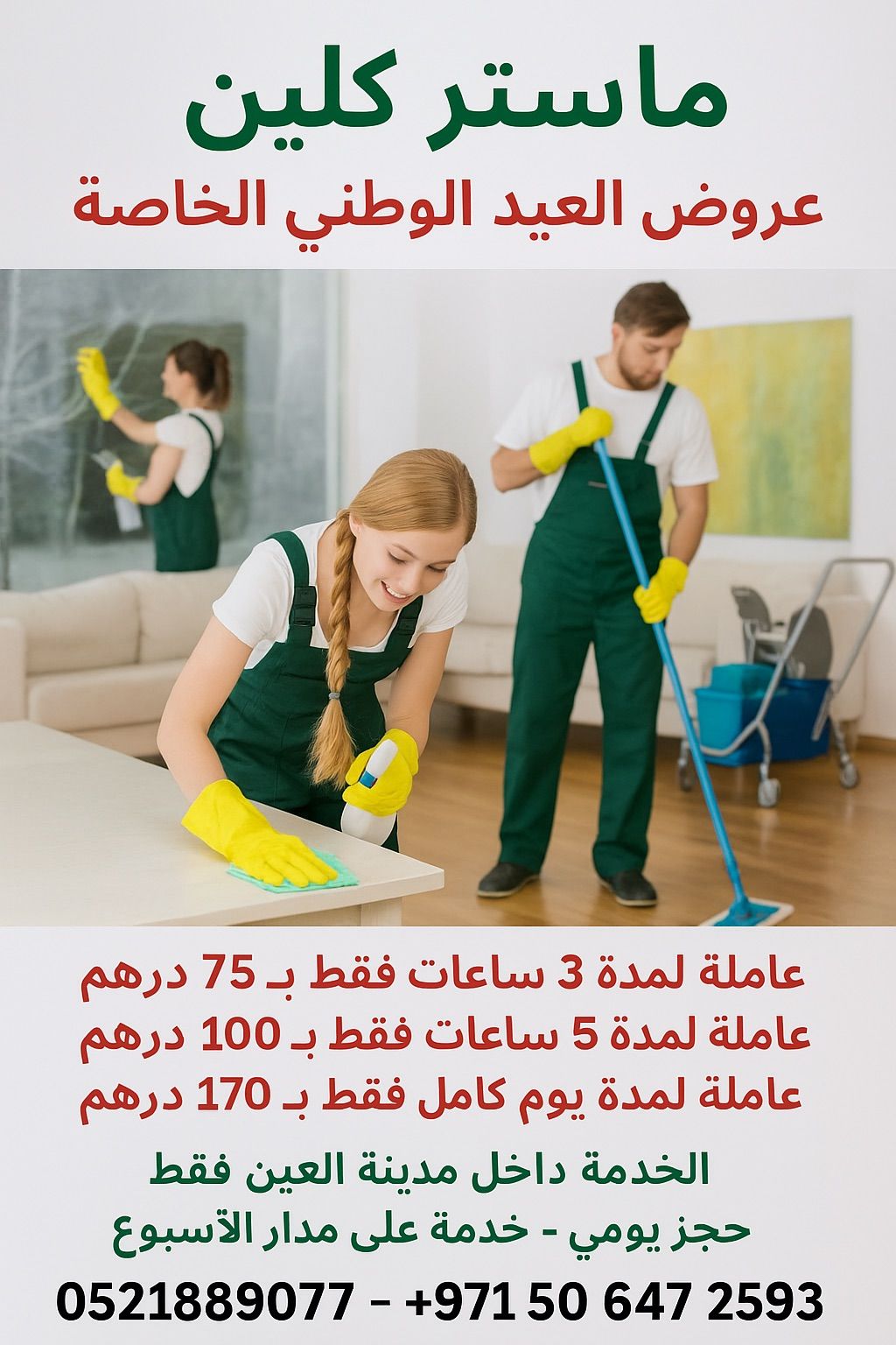ماستر كلين - تنظيف المنازل في العين - نوصل في نفس اليوم - أسعار واضحة 3 ساعات - 75 درهم 5 ساعات - 100 درهم يوم كامل - 170 درهم احجز الآن ماستر كلين - بيت نظيف، راحة بلا تعب
