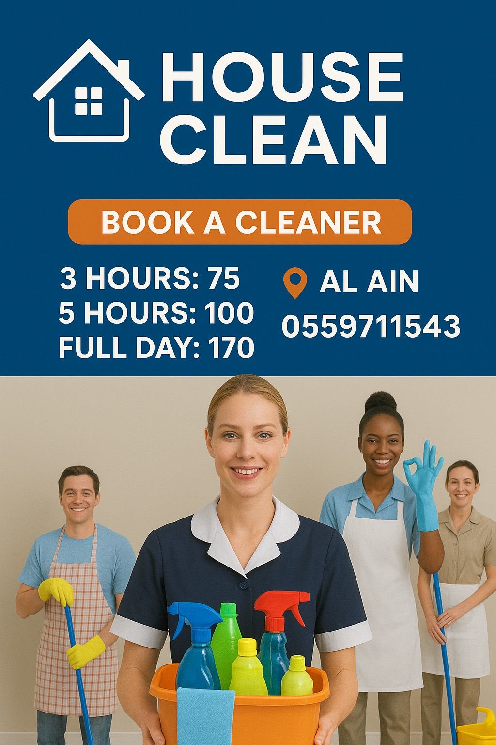 عروض خاصه لشركة هاوس كلين للتنظيف أطلب عاملة 3 ساعات 75 درهم عاملة 4 ساعات 90 عاملة 5 ساعات 100 عاملة يوم كامل 9 ساعات 170 دقة في مواعيد خبرة في تنظيف وجودة وضمان موجودين داخل مدينة العين وضواحيها فقط للتواصل