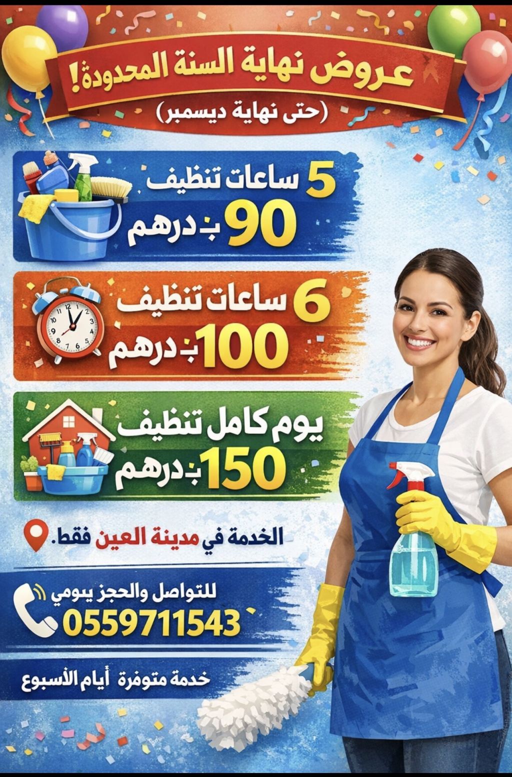 عروض لمدة محدودة الى نهاية شهر 12 عاملة لمدة 5 ساعات فقط ب 90 درهم عاملة لمدة 6 ساعات فقط ب 100 درهم عاملة لمدة يوم كامل فقط ب 150 درهم الخدمة داخل مدينة العين فقط حجز يومي