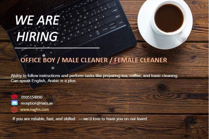 WALK IN Interview - on Sunday 21122025 Open position Office Boy - 1000 - 1300 (as per your experience) Male Cleaner - 1000 - 1100 (as per your experience) Female Cleaner - 1200 Address Abu Dhabi - Al Ain City (Al Muwaiji - Center - Bldg. 547) Al Ain City Center Building, M floor Rm. 02 Location Contact Person