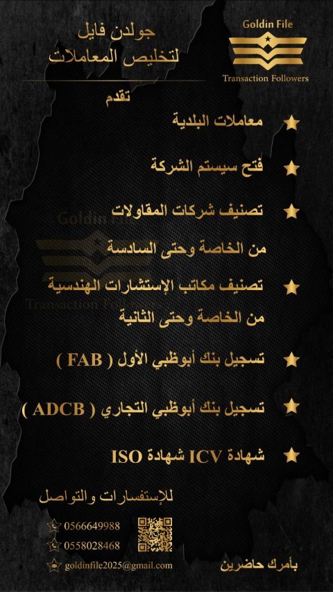 تصنيف شركات المقاولات من الخاصه الى الخامسه السادسة لتصنيف رخص المواطنين مالك ومقاول تصنيف مكاتب الاستشارات من الخاصه وحتى الثانيه متابعه سيستم البلدية تسجيل البنوك FAB وADCB شهادة أيزو شهادة icv