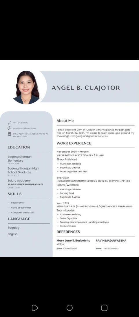أنا انس عبد المجيد مقيم في أبوظبي وابحث عن أي فرصة عمل مناسبة. عندي خبرة في خدمة العملاء، السيلز، الكول سنتر، ادخال البيانات، ومعاملات RTA وMOI. أجيد العربية والانجليزية، سريع التعلم وملتزم، وأحمل رخصة قيادة اماراتية. جاهز للعمل فورا. للتواصل