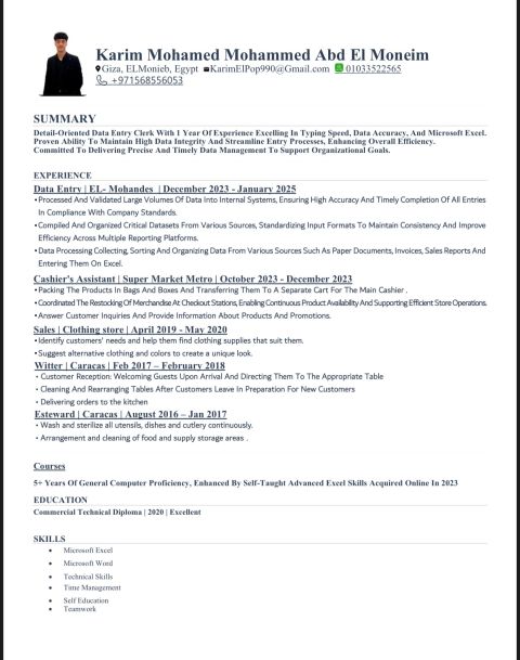 محتاج شغل داتا انتري عربي أو كاشير بفهم في الكمبيوتر واستخدام شخصي أكثر من 5 سنين سوبر ماركت بائع ومساعد كاشير