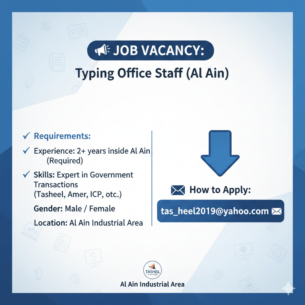 Ob Opportunity Typing Office Operations Specialist We are seeking experienced and dedicated Typing Office Staff (Male/ Female) to join our team in Al Ain Industrial Area. If you have extensive experience in UAE government transactions and a proven track record in the field, we want to hear from you. Requirements Experience Minimum of 2 years of local experience within Al Ain. Expertise Deep knowledge