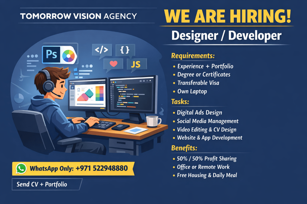 Tomorrow Vision Foundation is hiring a Designer/ Developer/ Programmer to work in digital advertising, social media management, and website & system development. Tasks Digital ads design, social media management, digital marketing for companies as partners or clients, video editing, CV design, website & system development. Requirements Experience with portfolio - degree or proven experience preferred