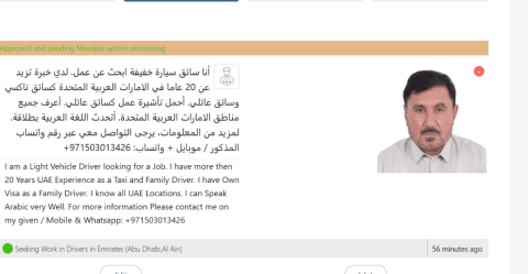 أنا سائق مركبة خفيفة ابحث عن عمل في أبوظبي أو العين. لدي تأشيرة عائلية خاصة بي لدي خبرة 20 عاما في القيادة في الامارات العربية المتحدة أعرف جميع مناطق الامارات، وأتحدث العربية بطلاقة لمزيد من المعلومات، يرجى التواصل معي على الرقم