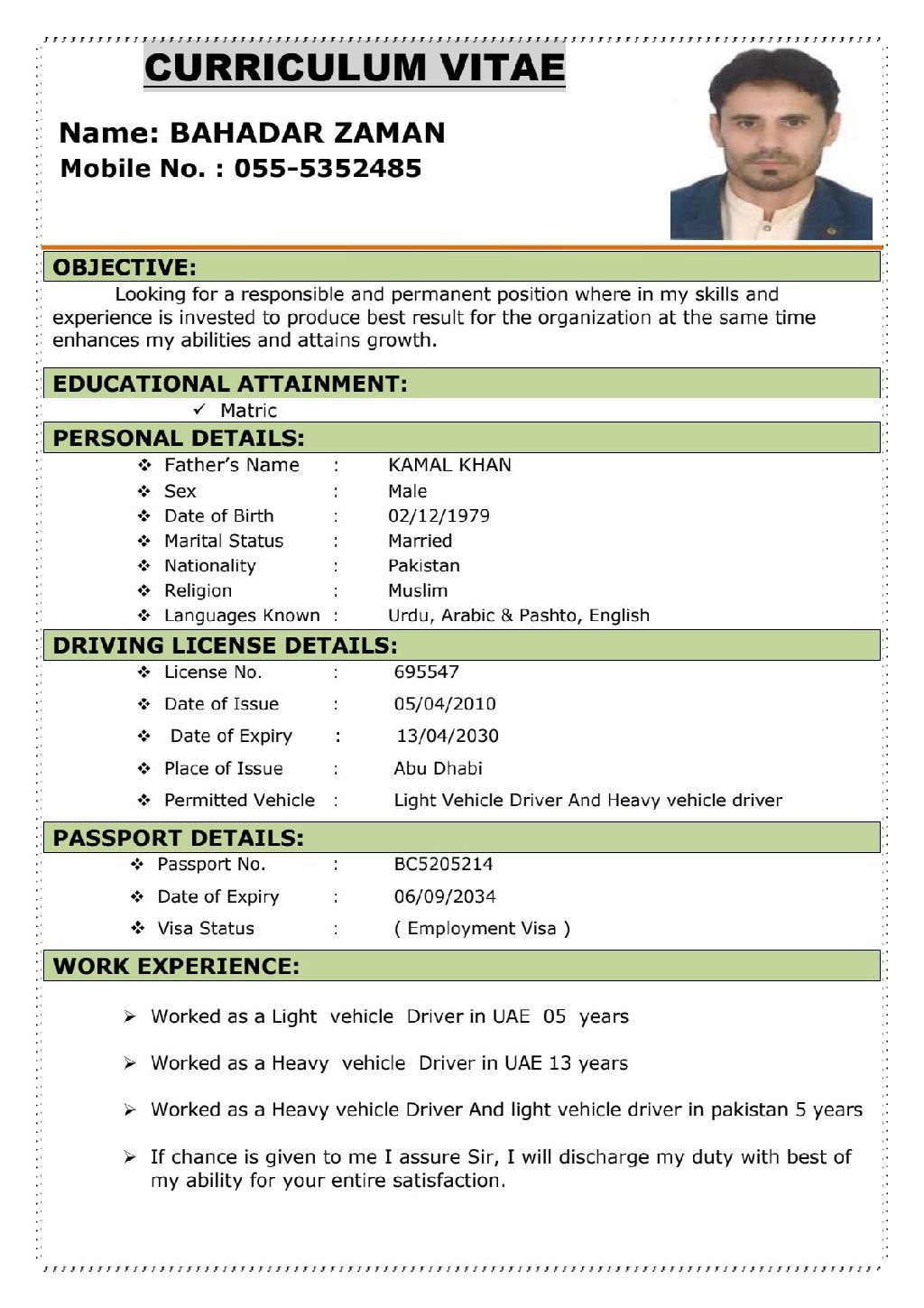 My name is Bahadur zaman from Pakistan I have already two licenses heavy and light vehicle I have 15 years Al Emirates roads and locations experience