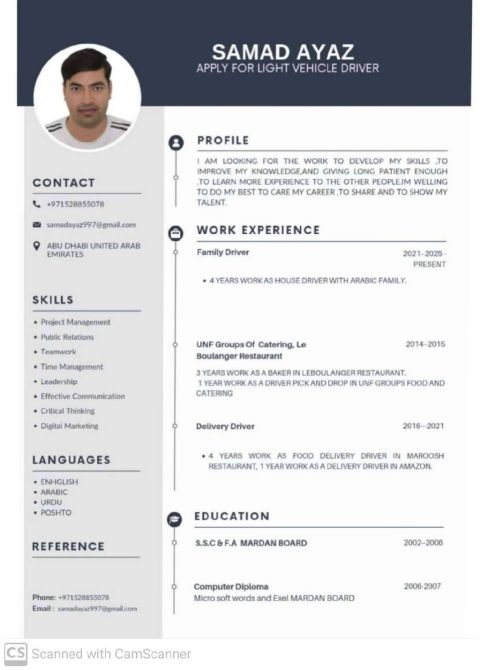 اسمي صمد أياز من باكستان أحمل رخصة قيادة مركبة خفيفة. لدي خبرة 11 عاما في العمل. عملت في شركة نقل منزلي لمدة 4 سنوات و4 سنوات في خدمة التوصيل عبر أمازون، و3 سنوات في خدمة التوصيل عبر مجموعات UNF. أعرف جميع طرق ومواقع دولة الامارات العربية المتحدة. اذا كان هناك شاغر لسائق منزل أو شركة، فأرجو منكم مساعدتي