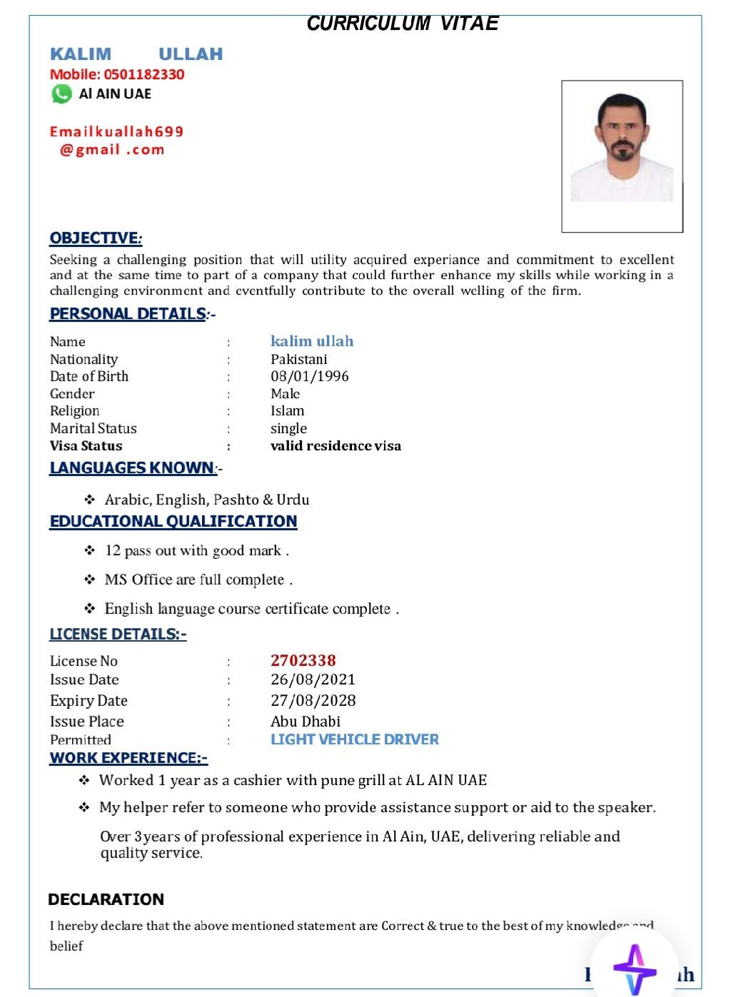 My Name is Kaleemullah baloch. I am from Pakistan Balochistan. I am a baloch. I am 29 years old. I have 5 years private home driving experience UAE. I am looking for a driving job. Speak Arabic, English, Balochi, Urdu