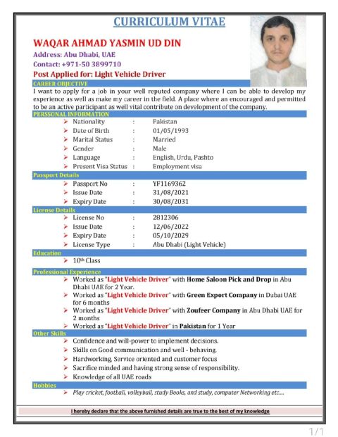 My name is Ahmed Ajmal. I am an Indian. I am currently based in Dubai. I have 14 years of light vehicle driving experience and I have a clear traffic record. Please let me know if there is a driver vacancy