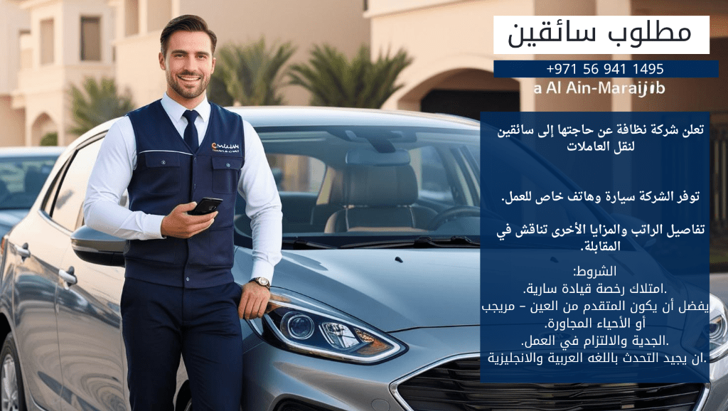 مطلوب سائق للعمل في شركة تنظيف بمدينة العين - منطقة الجيمي يشترط معرفة جيدة بمناطق العين يشترط وجود إقامة سارية ورخصة قيادة يرجى إرسال السيرة الذاتية مع صورة رخصة القيادة فقط على الرقم الواتساب. بدون اتصال