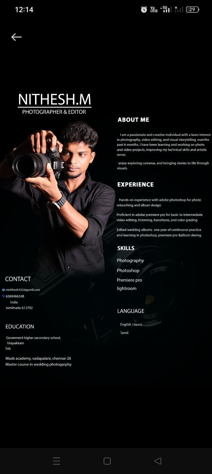 I am nithesh from India. This is my CV professional of photography, videographer, video editor, photo editor etc. I came in UAE and I want to do work as I have experience of this profession. So, can u call me for interview so that I can start my job quickly