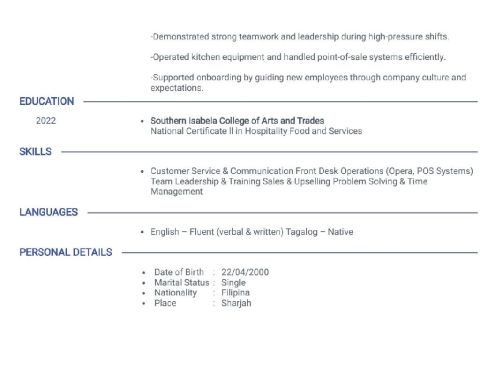 مشرفة مكتب الاستقبال منازل القمر للعطلات - رحبت بالضيوف والعملاء بطريقة احترافية وودودة، مما خلق انطباعا أولىا ايجابيا. ردت على المكالمات الهاتفية، وأدارت الحجوزات، وحددت المواعيد، وتعاملت مع الاستفسارات العامة. حافظت على منطقة استقبال نظيفة ومنظمة مع إدارة المهام الادارية اليومية. ساعدت في البريد الوارد والصادر، وحفظ المستندات، وجرد اللوازم المكتبية. نسقت مع الأقسام المختلفة (ألت