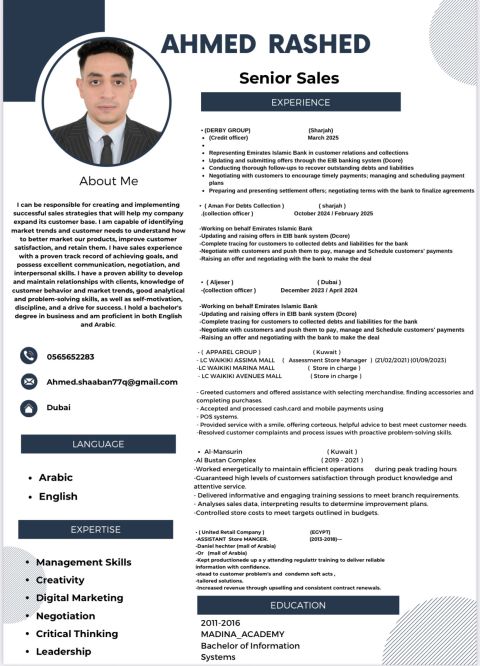 أحمد شعبان. ابحث عن فرصة عمل تناسب خبرتي الواسعة في مجالات البنوك، التحصيل، والمبيعات. لقد سبق لي العمل في كبرى الشركات العالمية، كما امتلك خبرة عملية في عدة دول عربية، منها مصر، الكويت، قطر، والامارات. أتطلع لتقديم مهاراتي والمساهمة في نجاح مؤسستكم الموقرة. شكرا لكم
