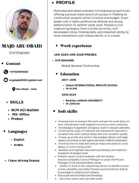 مهندس مدني حاصل على بكالوريوس هندسة مدنيه ورخصة قيادة اماراتية، ابحث عن فرصة عمل مناسبة في مجال المباني. أتميز بالجديه والرغبة في التعلم واكتساب الخبرة العملية داخل الدولة ويمكنني اجتياز امتحان البلدية، ولدي خبرة في مجال الطرق داخل الدولة لمدة سنة