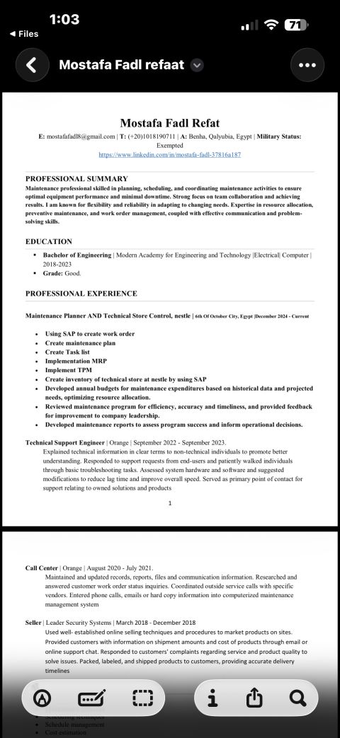 مهندس مدني دفعه 2015 خبرة في مصر (09) سنوات بين أعمال التنفيذ الأبراج والفلل بشركة (جيك للمقاولات العامة) وشركة (سيفاك) وشركة (الأه رام للمقاولات العامة) والمكتب الفني من حصر ومستخلصات وأعمال شوب درونج شركة (الأه رام للمقاولات العامة) وشركة (بنيان) وشركة (جميرا للمقاولات العامة) وخبرة في الامارات سنة في أعمال التنفيذ شركة (الخط الأزرق) ولدي رخصة قيادة اماراتية