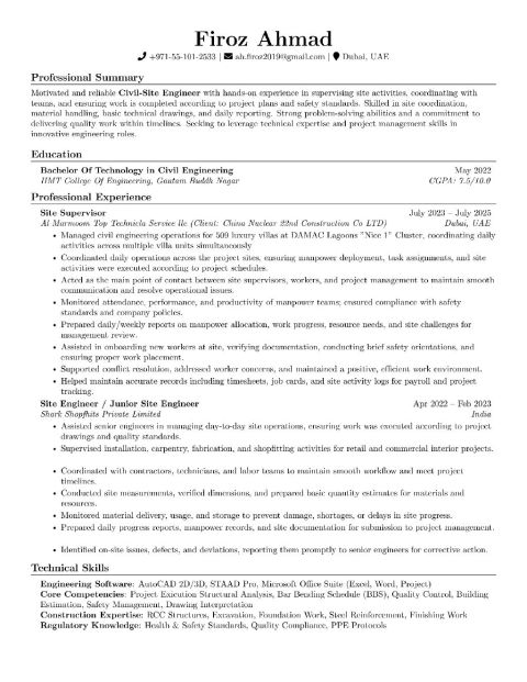 Detail - oriented and hardworking Civil Site Engineer with hands - on experience in supervising site operations, managing construction activities, and ensuring work quality as per drawings, specifications, and safety standards. Skilled Coordination with subcontractors, Monitoring daily progres, resolving site issue to Maintain smood workflows