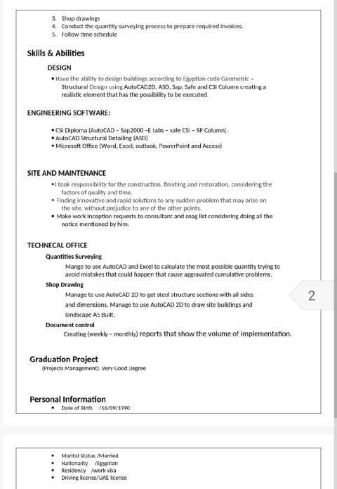 مهندس مدني سوداني خبرة داخل الدولة (6 سنوات) معتمد من بلدية دبي أرضي وأربع طوابق مقاولات وأرضي وأول هدم وازالة انقاض وأيضا لدي قيد هندسي من بلدية أبوظبي وعلي دراية بنظام بلدية دبي ومؤسسة محمد بن راشد للاسكان وحساب الكميات وعمل الدفعات وكيفية التعامل مع الملاك ولدي معرفة ببعض البرامج الهندسيه ولدي رخصة قيادة سارية