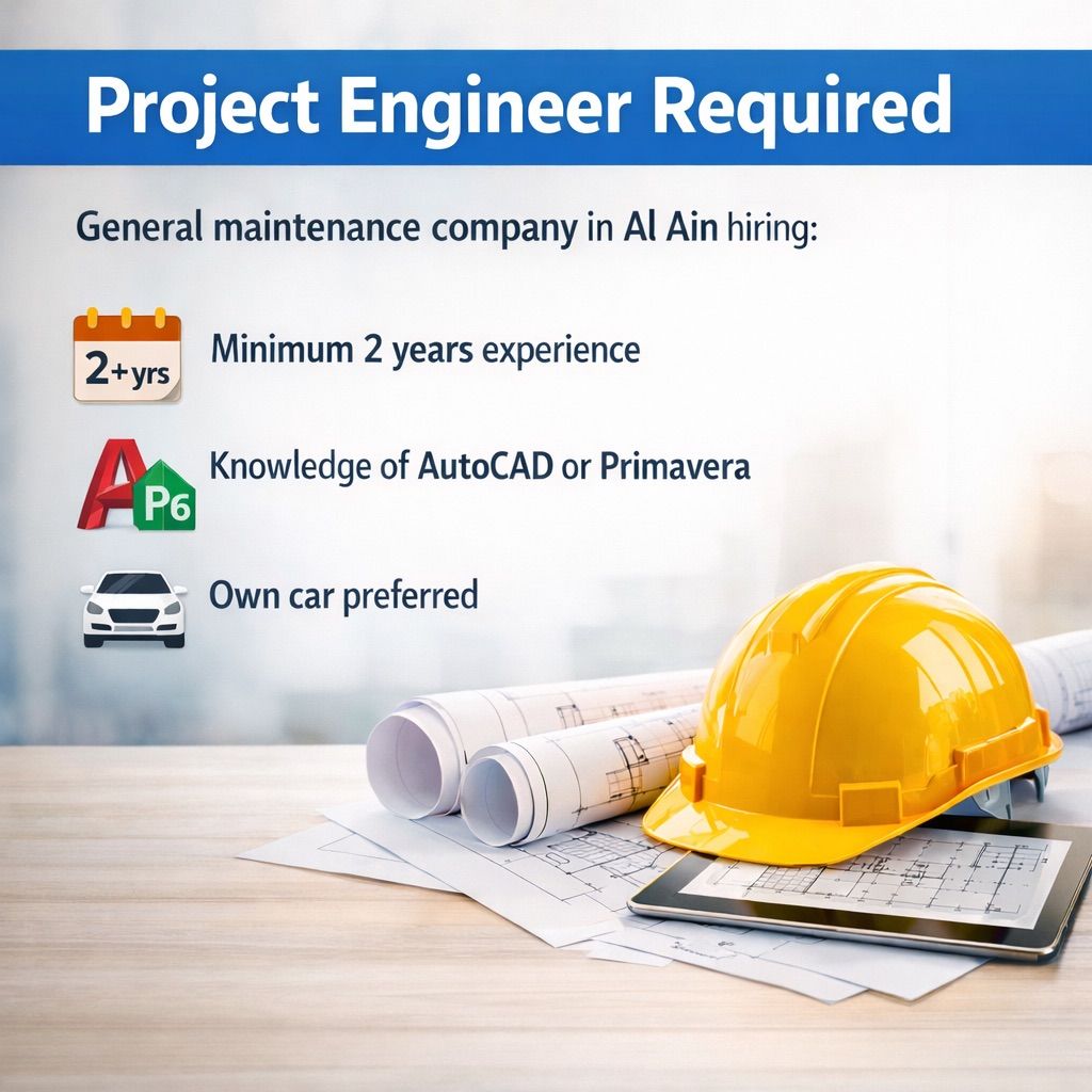مطلوب مهندس خبرة ادارة مشاريع في صيانة العامة منطقة مركز المدينة، لدى شركة مقرها في مدينة العين. خبرة لا تقل عن سنتين مع دراية بالأوتو كاد أو بريما فيرا لاعداد المشاريع يفضل من لديه سيارة