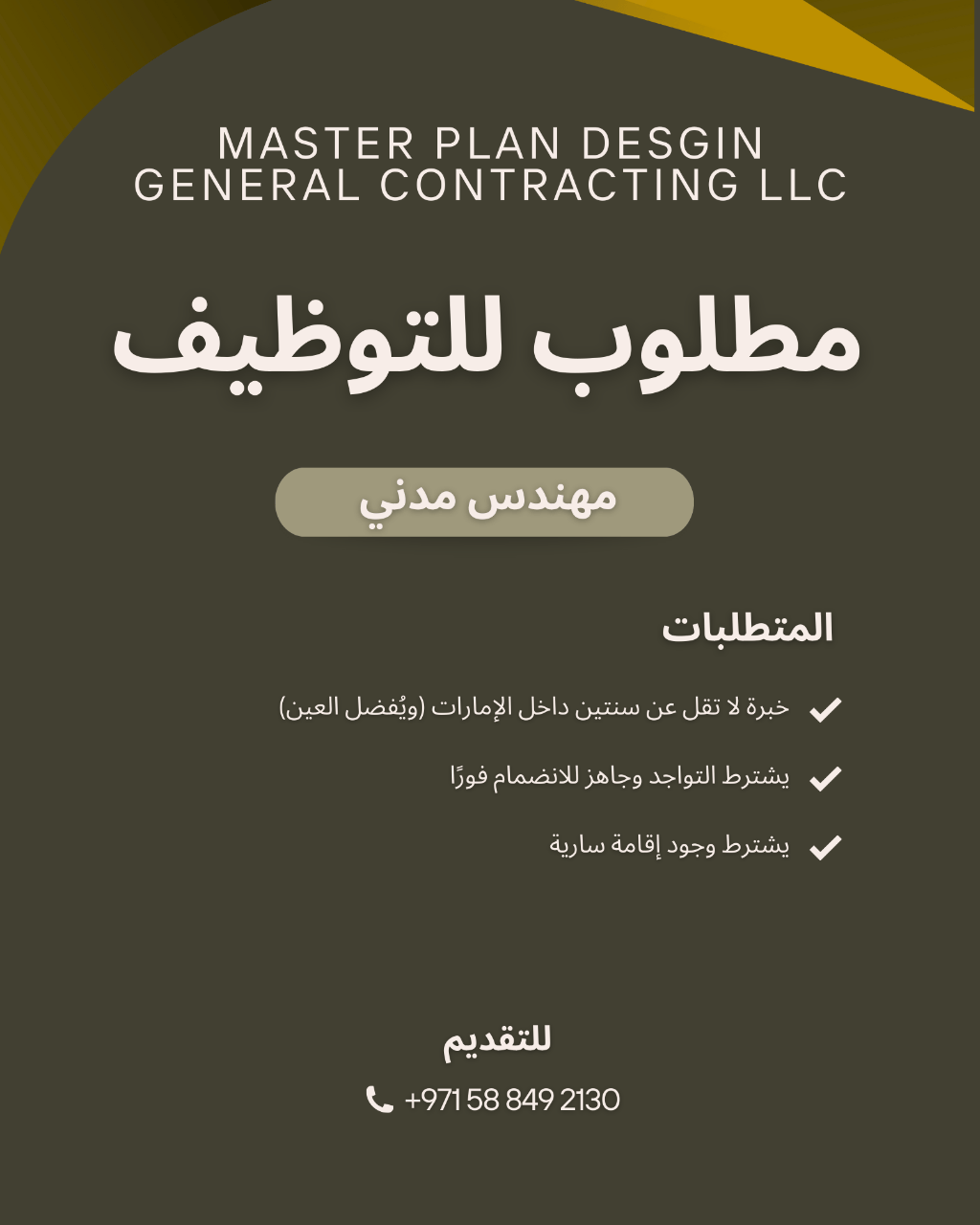 A General Contracting Company is hiring a Civil Engineer with a minimum of 2 years’ experience in the UAE. Previous experience in Al Ain or Abu Dhabi is required, with immediate joining availability. Contact WhatsApp only