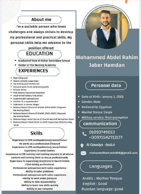 اعمل كمنقذ لحمامات السباحة والشواطئ، وأقوم بتدريب المنقذين على جميع محتويات الانقاذ والإنعاش القلبي الرئوي. أقوم بتنظيف حمامات السباحة (بالمكنسة) أقدم دروس سباحة خاصة. أقوم بعمليات انقاذ خاصة. لدي شهادات انقاذ وسباحة، وشهادات اسعافات أولية، وشهادات خبرة في السياحة في الانقاذ والإسعافات الأولية. أنا متاح داخل دولة الامارات العربية المتحدة