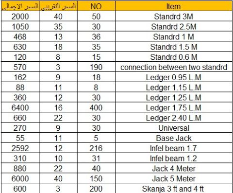 سقالات للبيع بالحبة حسب كل نوع والأسعار موضحة بالجدول المرفق Scaffolding items
