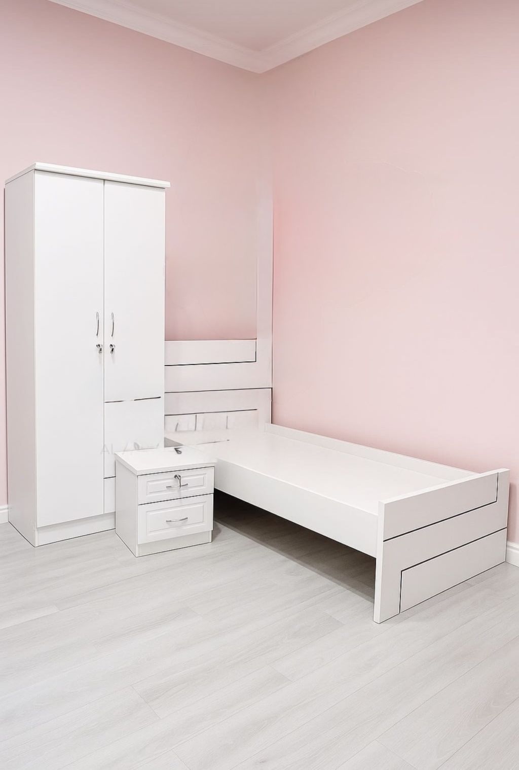 AED950) White furniture bedroom setup. Here's a breakdown of the items you've listed 1. AMF MDF Bed 120/ 190 cm ( U shaped) 2. MD Mattress 120/ 190/ 12 cm 3. Side Table Model 7308 N 4. Cupboard 2 - door AMF - 7728 Available for sale in all locations in UAE, delivery