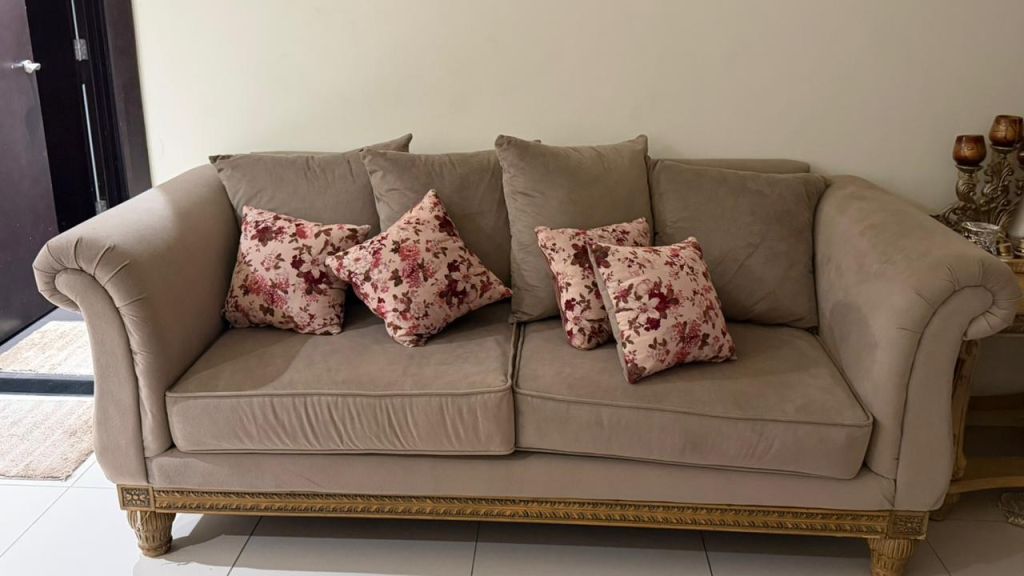 طقم كنب مكون من 7 مقاعد بحالة جيده مطلوب 1000 درهم متوفر منه لونين، بيح وطوبى