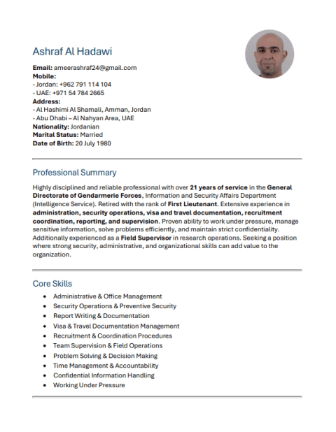 Looking for a Job Jordanian male with 21 years of experience in security and protection, including related administrative work. Participated in international assignments, including stadium security teams during the FIFA World Cup in Qatar. Available for immediate employment. Please contact me privately