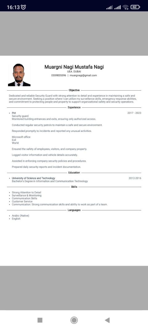 شاب سوداني مقيم لدي خبرة في مجال الأمن 5 سنوات في الامارات خبرة في استخدام الحاسب الآلي حاصل علي شهادة الصحة والسلامة المهنية الا وشاء خبرة في مجال الاستقبال وخدمة العملاء في مستشفى. متمرس علي العمل الأمن في كل المواقع بنوك فنادق مواقع انشاءت ابحث عن عمل يناسب خبراتي. ناس مكاتب التوظيف ما في حد يدخل علي. وأي شركة أو مؤسسة تطلب مني تكاليف الإقامة الرجاء لا تتواصلوا معي