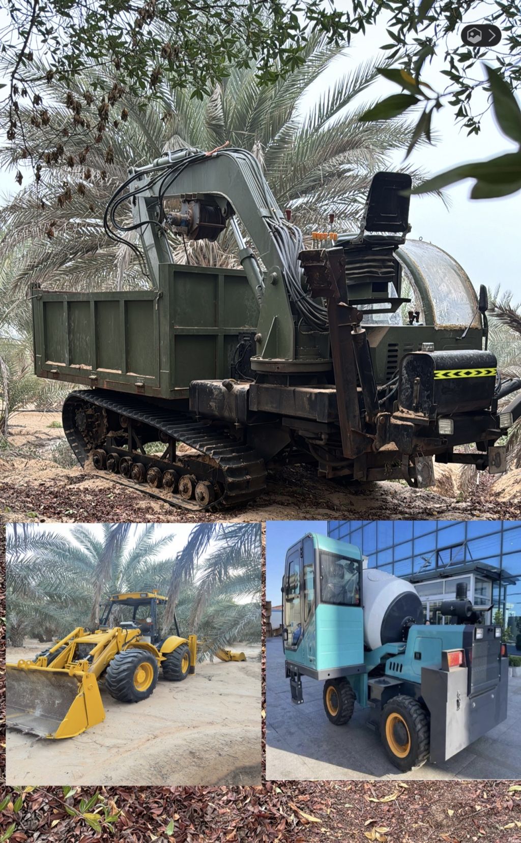 Three pieces of equipment for sale 1) Old JCB model, not registered, domestic use, needs maintenance, 7000 dirhams, engine has some issues with some service done. 2) Cement mixer that carries sand, cement, and gravel, pours water and mixes with just one operator, produces one cubic meter in 15 minutes, not registered, all papers are with me. 3) Excavator and dump truck, heavy duty, very strong, tracks