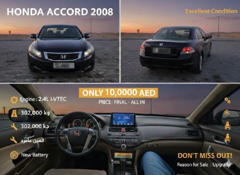Honda Accord 2008, GCC specifications, in showroom condition. Price: 10,000 AED. Full ownership for one year. Mileage: 302,000 km. Engine: 2.4L VTEC. Fully serviced. Bluetooth screen, beige interior, elegant wood trim, steering wheel controls, cruise control, aluminum rims, electric mirrors.