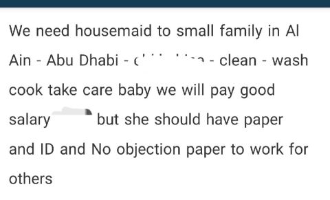 مطلوب عاملة تجيد امور البيت من تنظيف وغسيل وكوي وطبخ ورعاية طفل رضيع بشرط تكون إقامة ولا تكون مخالفة وأن يكون السن تحت 30 سنة وتقيم معنا في نفس البيت وذلك في منطقة الجاهلي بمدينة العين في أبوظبي ( م ص رية)
