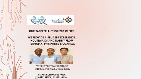 مكتب تدبير مرخص ومعتمد نوفر لكم عاملات منزليات مقيمات مدربات وموثوقات من اثيوبيا - أوغندا - الفلبين - العاملات منزيات مدربات على التنظيف - الكي - الغسيل الطبخ (حسب الجنسية) رعاية الاطفال والرضع مساعدة الاطفال في الدراسة دعم كبار السن